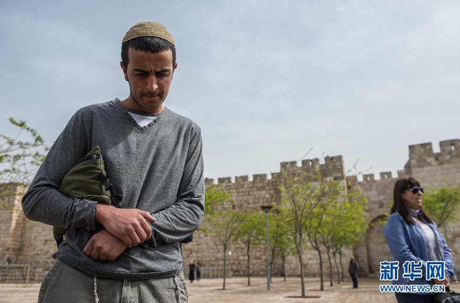 4月16日,在耶路撒冷的雅法门附近,一名犹太男子肃立为大屠杀遇难者默哀。当日上午10时,两分钟的防空警报响彻以色列各地,司机下车,行人止步,为二战中大屠杀遇难者默哀两分钟。以色列大屠杀纪念日根据犹太历法确定,今年的纪念日自4月15日日落开始,至16日日落结束。今年的主题是“痛苦的解放和重返生活——二战结束70年”。新华社记者李睿摄