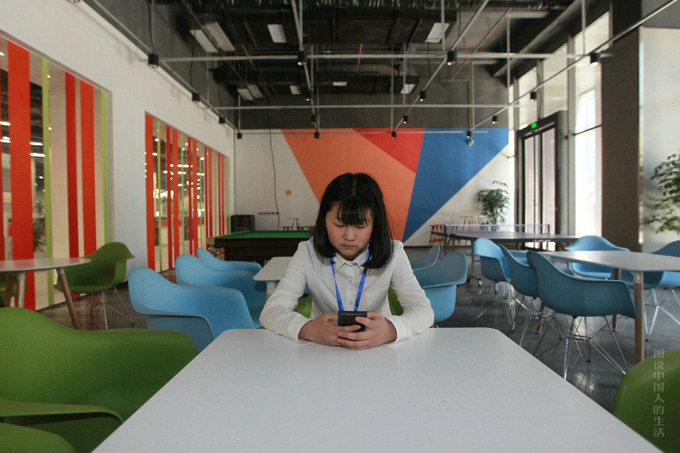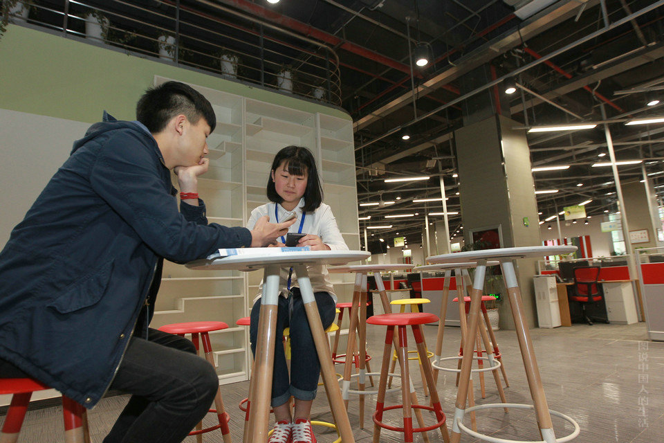 在贵阳大数据呼叫中心示范基地,有很多休闲娱乐设施,曾静在见习之余,便会坐在休闲吧,与朋友分享实习经历和当一名见习接线员的收获。