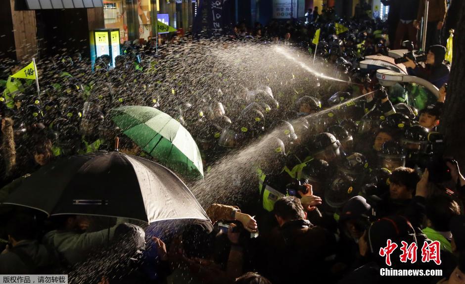当地时间2015年4月16日,韩国首尔,“岁月号”沉没事件的遇难者家属和支持民众在首尔广场举行追思会,会后情绪激动人群开始游行,并与警方发生激烈冲突。图为警方向示威者喷射含有辣椒水的液体,以驱散人群。