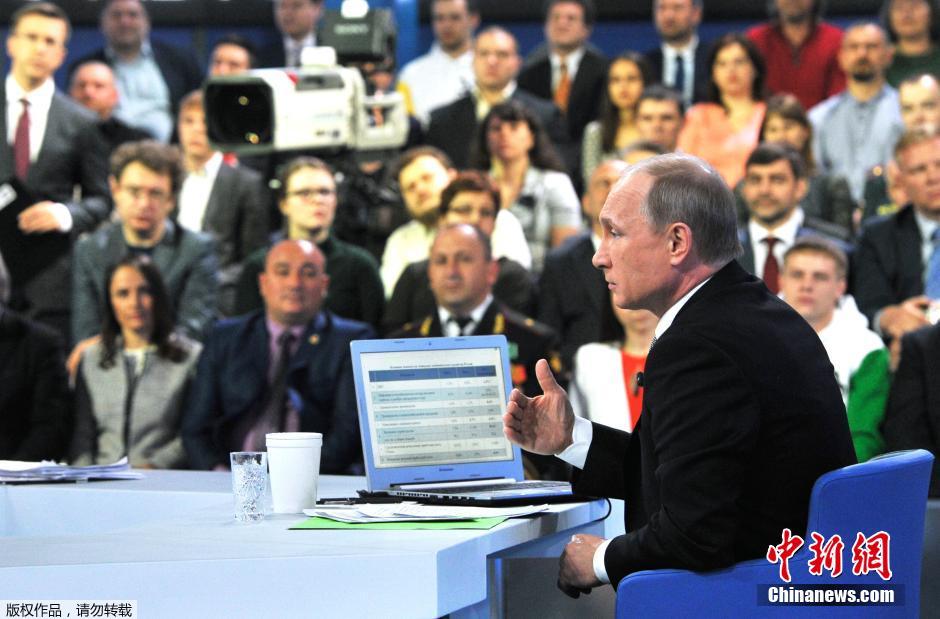 当地时间2015年4月16日,俄罗斯莫斯科,俄罗斯总统普京与民众进行直播连线,回答民众感兴趣的社会、民生、内政、外交等问题。普京在连线伊始就指出,俄罗斯国内经济水平需要进一步提升。