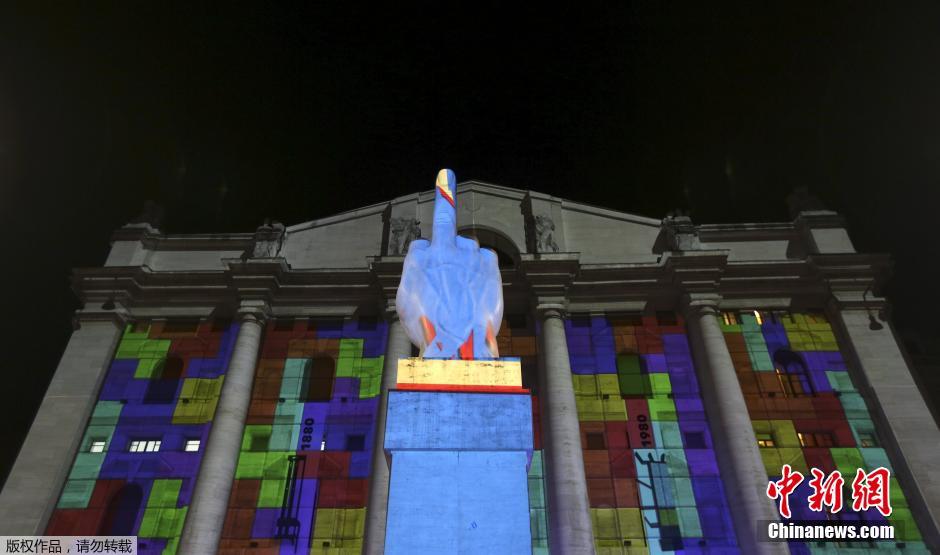 当地时间2015年4月15日,意大利米兰,米兰设计周期间,米兰证券交易所外点亮多彩照明装置。