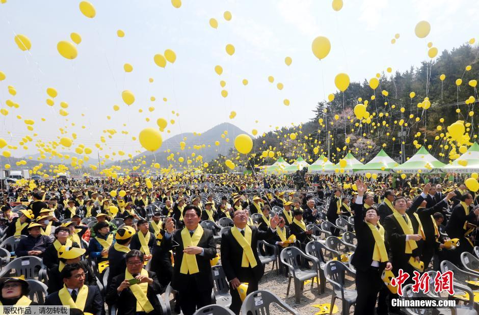 当地时间2015年4月16日,韩国珍岛,“世越号”沉船事件一周年,韩国民众放飞黄色气球悼念逝者。