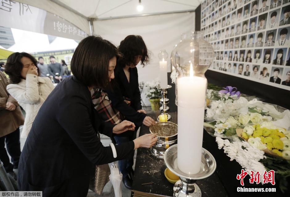 当地时间2015年4月16日,韩国安山,“世越号”沉船事故一周年,民众前往纪念大厅悼念遇难者。