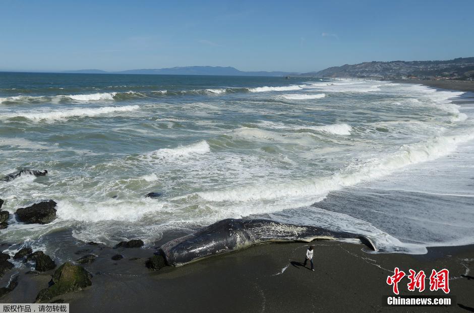 图为被巨大海浪冲上岸的抹香鲸尸体。