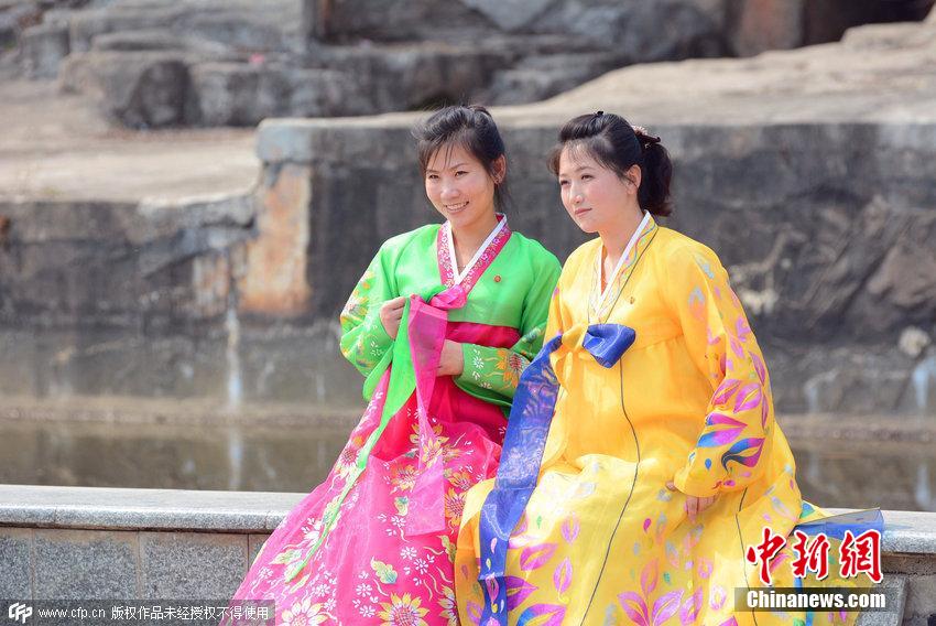 2015年4月15日,在吉林省吉林市北山风景区,来自北朝鲜的女留学生们身穿鲜艳的服装兴高采烈的游览北国江城吉林市的春日风光。当日是朝鲜的太阳节,一批来自北朝鲜的女留学生和来中国劳务的女义工们共同走进金日成母校吉林毓文中学参观学习,又游览了吉林市著名的北山风景区风光,并集体合影留念。