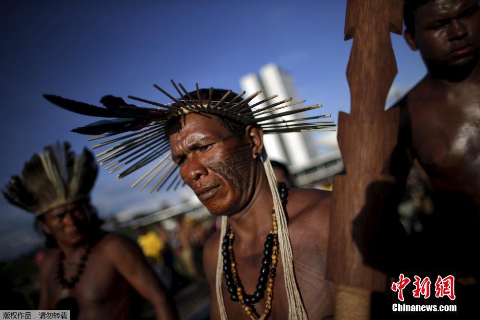 当地时间2015年4月15日,巴西巴西巴西利亚,巴西印第安部落持续示威,要求讨论土地问题和原著居民权利。