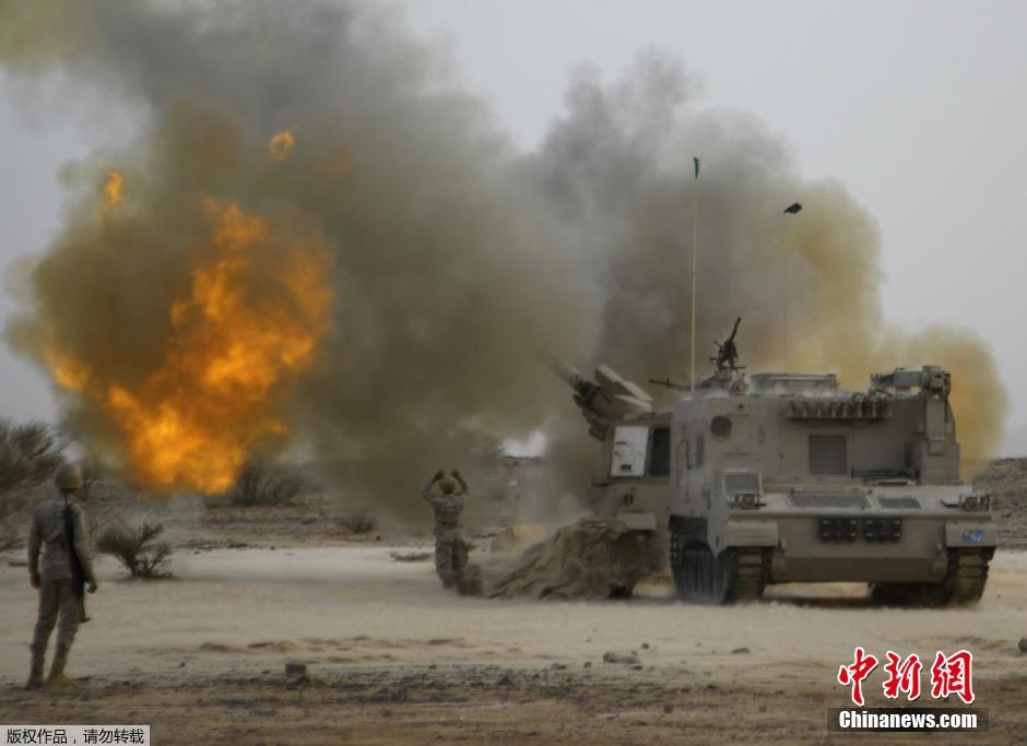 图为沙特坦克炮轰也门边境胡赛武装据点。联合国安理会14日通过2216号决议,决定对胡塞武装相关个人和实体实施武器禁运,并促请所有成员国特别是也门邻国检查所有运往也门的货物。