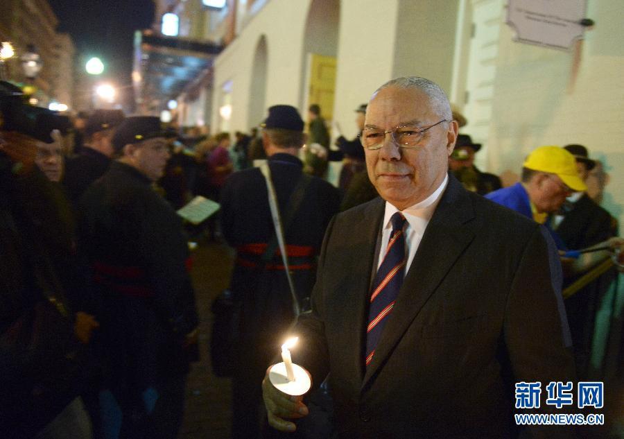 4月14日,在美国华盛顿的福特剧院外,美国前国务卿鲍威尔参加纪念前总统林肯遇刺150周年的守夜活动。新华社记者 殷博古 摄 图片来源:新华网