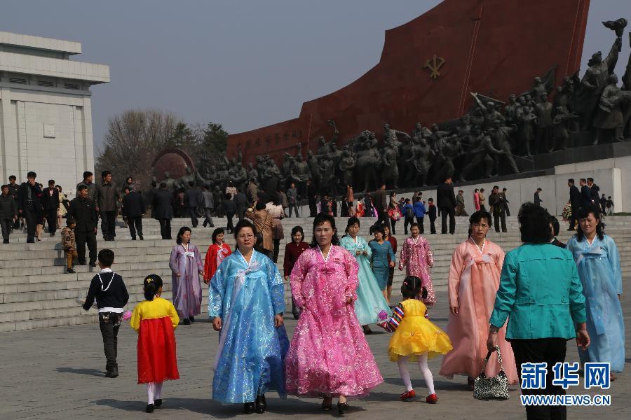 4月15日,在朝鲜首都平壤万寿台,身着传统服饰的朝鲜妇女庆祝“太阳节”。当日是朝鲜已故国家领导人金日成诞辰103周年纪念日,即朝鲜的“太阳节”,朝鲜举办了一系列纪念活动。 新华社记者 陆睿 摄 图片来源:新华网