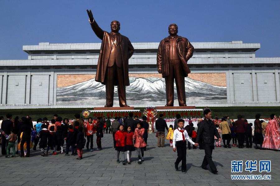 4月15日,朝鲜群众聚集在朝鲜首都平壤万寿台,向金日成和金正日的铜像献花。当日是朝鲜已故国家领导人金日成诞辰103周年纪念日,即朝鲜的“太阳节”,朝鲜举办了一系列纪念活动。 新华社记者 陆睿 摄 图片来源:新华网