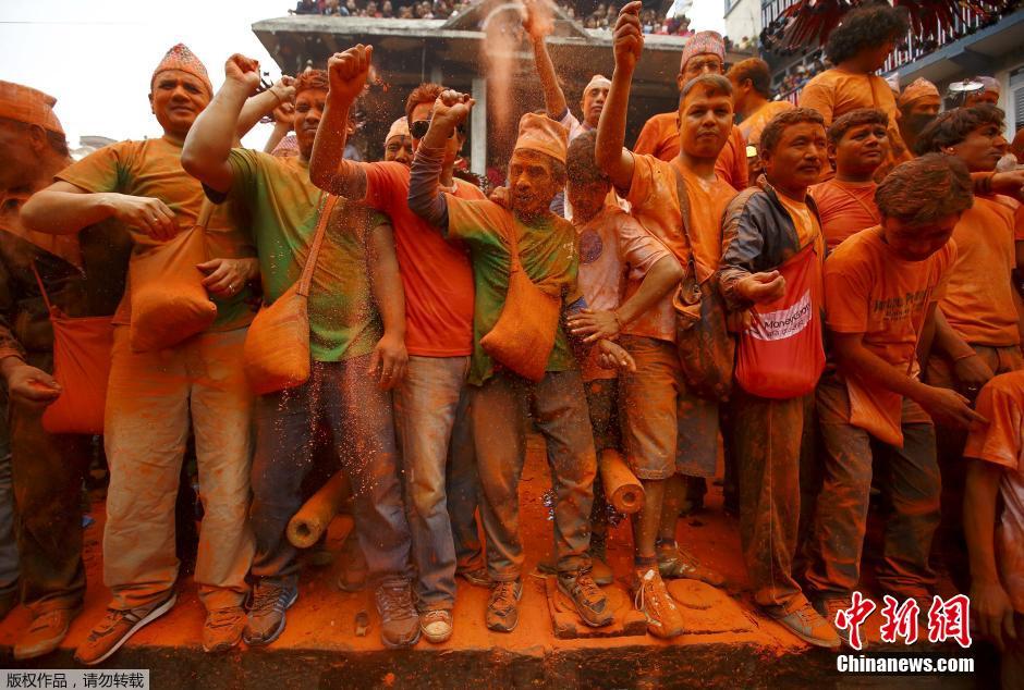 当地时间4月15日,尼泊尔民众洒朱砂粉庆祝毕斯基(Bisket Jatra)节。据悉,该节日是尼泊尔的四大传统节日之一,也被称为“尼泊尔新年”。当地民众会在此时互相抛洒朱砂庆祝新年。