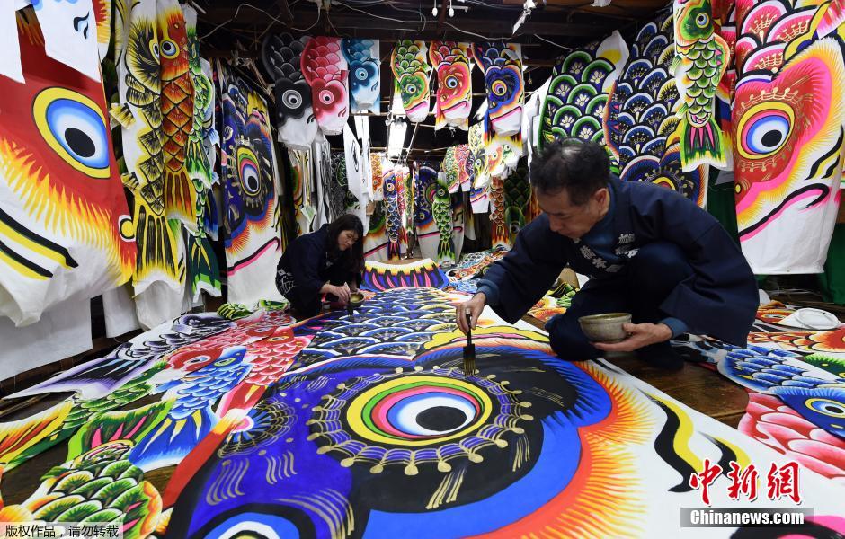 当地时间2015年4月15日,日本东京北部50公里处的一间工厂里,工匠Masaru Hashimoto正在细心绘制鲤鱼旗,为即将到来的儿童节做准备。这家专门制作鲤鱼旗的工厂已经有107年的历史。