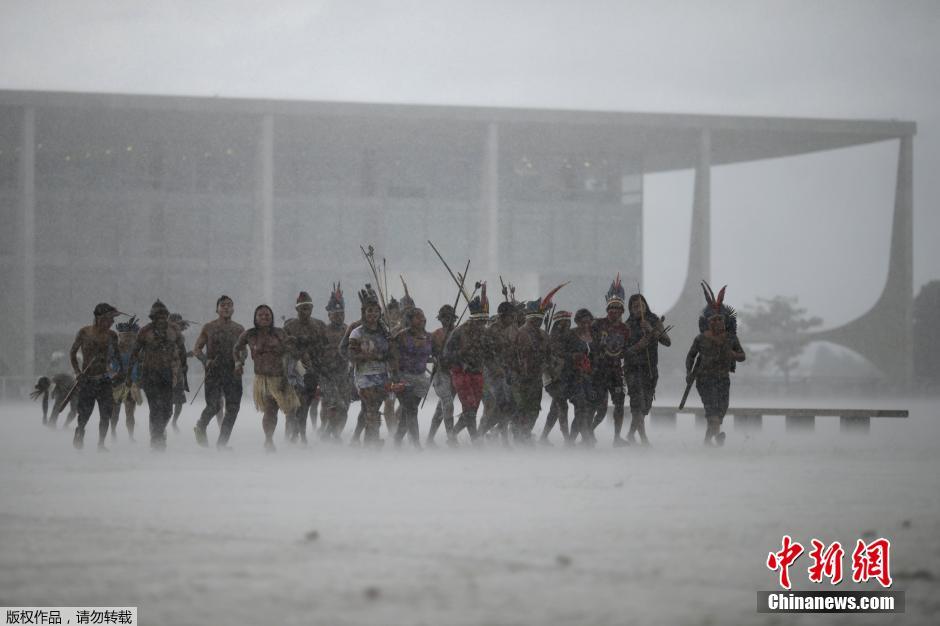当地时间2015年4月14日,巴西巴西利亚,印第安部落在国会大厦、最高法院以及总统府等地示威,要求讨论土地问题和原著居民权利。