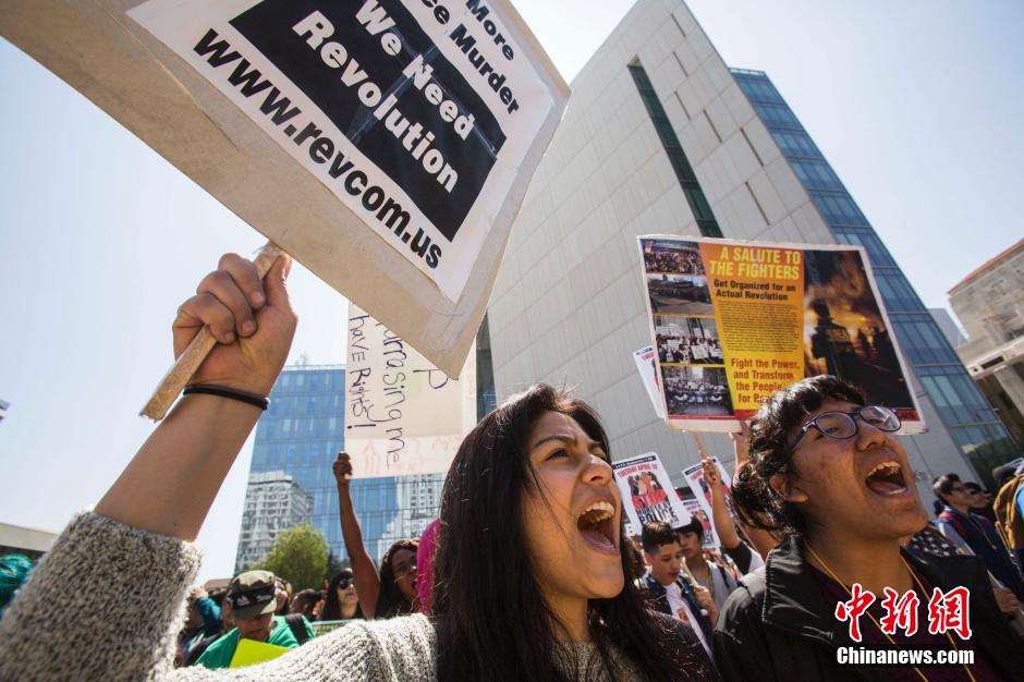 4月14日,在美国洛杉矶,大批示威者参加一个反对警察暴行集会。当天全美有超过25个城市同时举行示威抗议,呼吁停止警察暴行。图为示威者在洛杉矶警察总部前高呼口号。 中新社发 林戈 摄