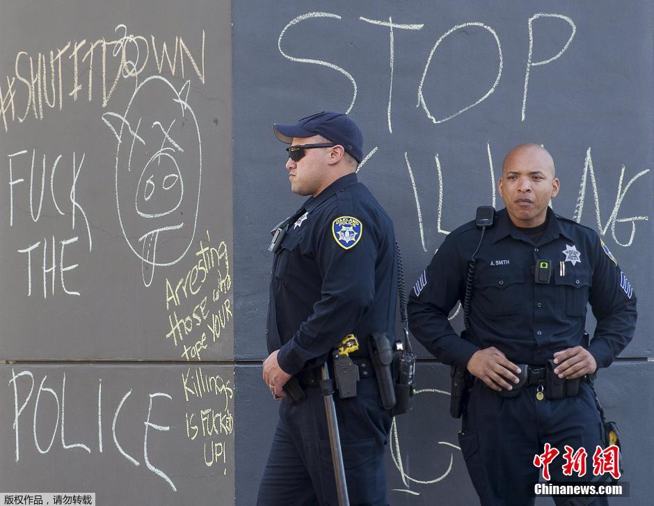 图为两名警察从涂鸦墙前走过。