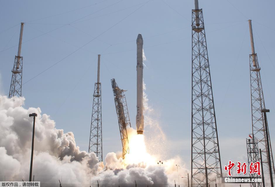 图为正在搭载“龙飞船”的猎鹰9号正在发射。