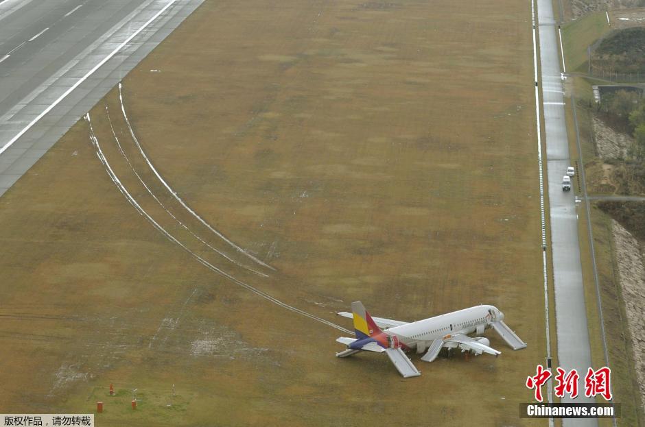 图为滑出跑道的韩亚航空162航班A320客机。日本国土交通省发表消息称,该客机在日本广岛机场降落时,尾部接触跑道,并产生激烈火花,客机随后冲出跑道并停止。