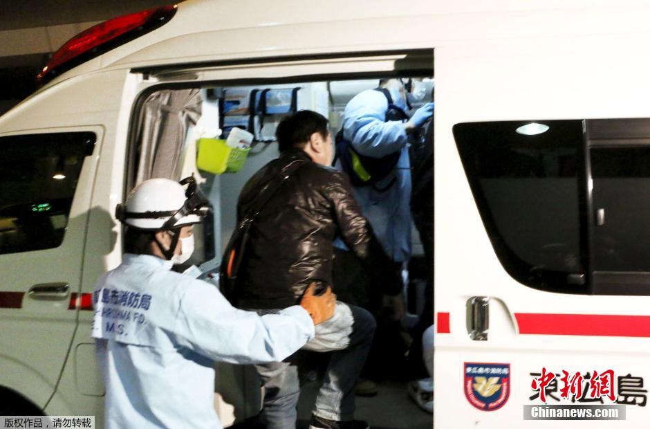 图为医疗救援人员将一名乘客送入救护车。据三原市消防总部介绍,机上22名乘客受轻伤。广岛机场消防署称,客机在降落时,发动机冒出火花,乘客利用紧急滑梯脱离客机。