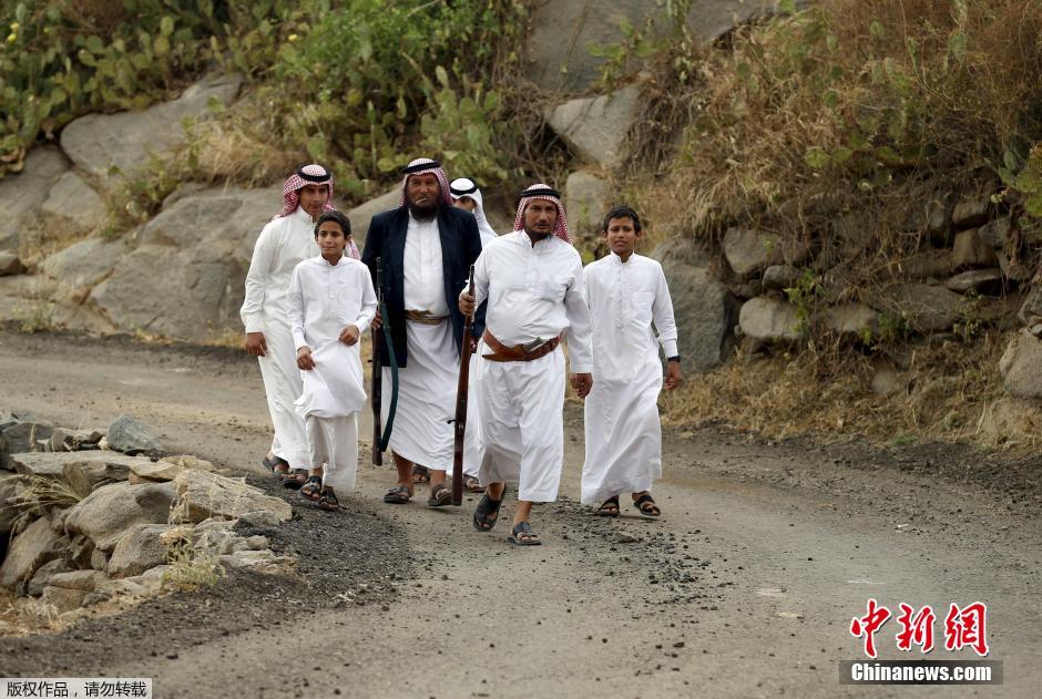 图为一组沙特志愿者正在巡逻,其中还有小孩。