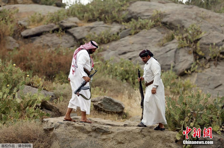图为两名持枪的沙特志愿者。