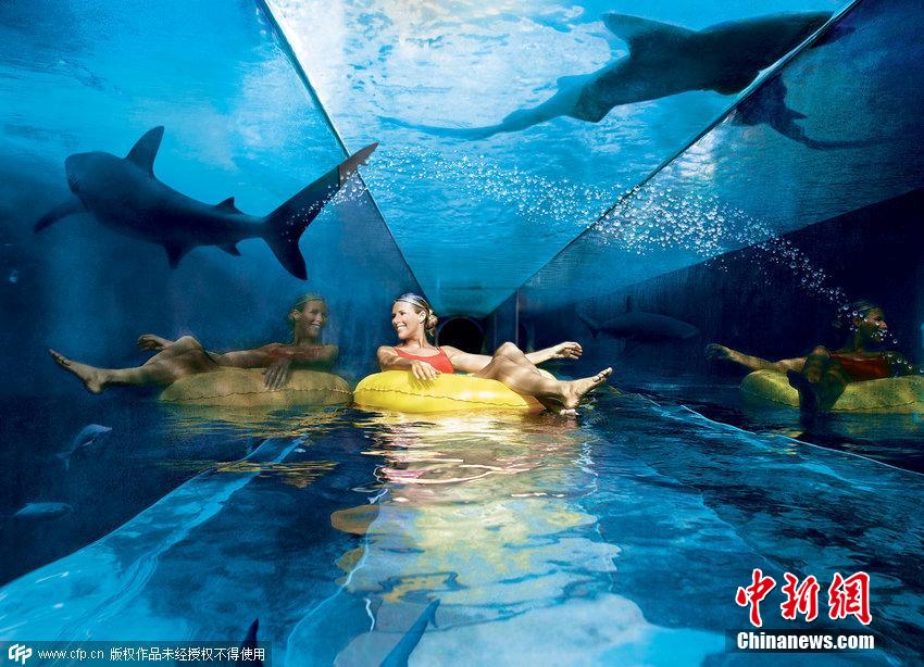 2015年4月14日消息(具体拍摄时间不详)巴哈马天堂度假胜地水上冒险乐园的滑道“The Leap of Faith”。游客从神塔的顶部俯冲而下,进入一个透明管道,穿过四周尽是鲨鱼的鲨鱼馆,享受鲨口脱险的刺激。水上冒险乐园“AQUAVENTURE”占地141英亩,700万加仑水,一条一英里长的水道和12个水池。