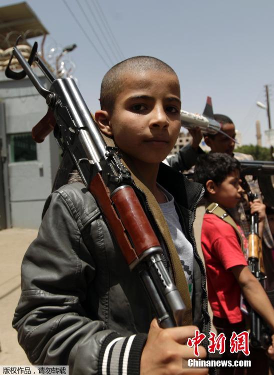 图为也门儿童手持枪械在联合国驻也门办事处外示威。