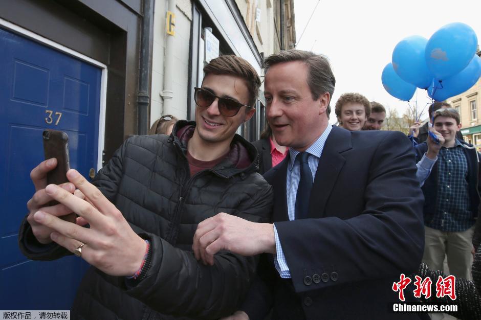当地时间2015年4月13日,英国阿尼克,英国首相卡梅伦造访当地,与民众亲切交流,大方自拍合影,为大选造势。