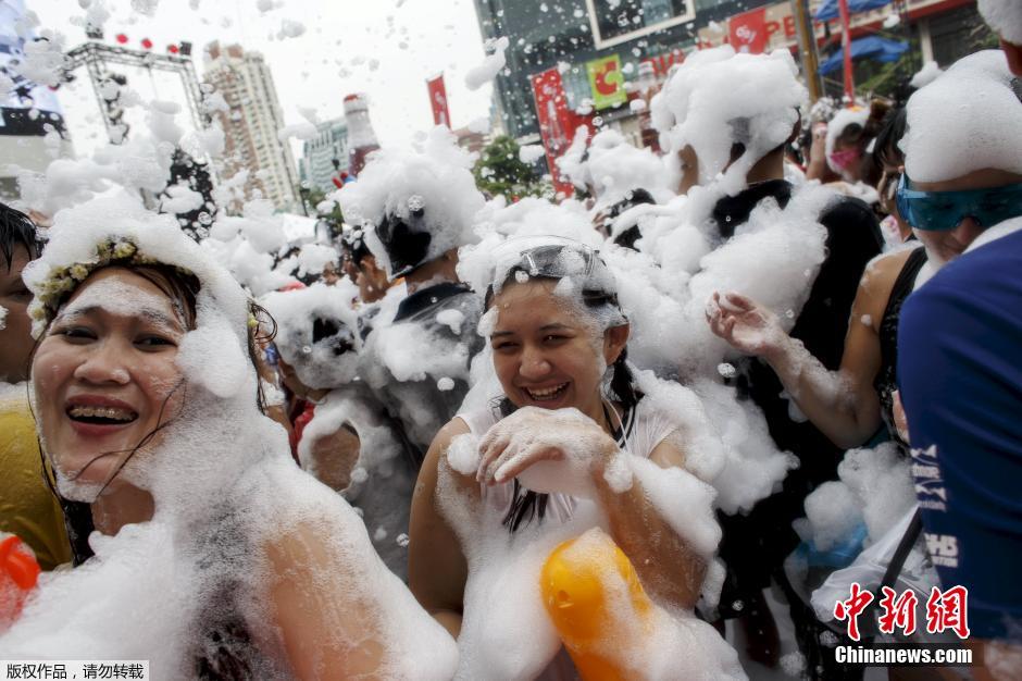 4月13日,泰国曼谷上演泡沫大战,庆祝宋干节。