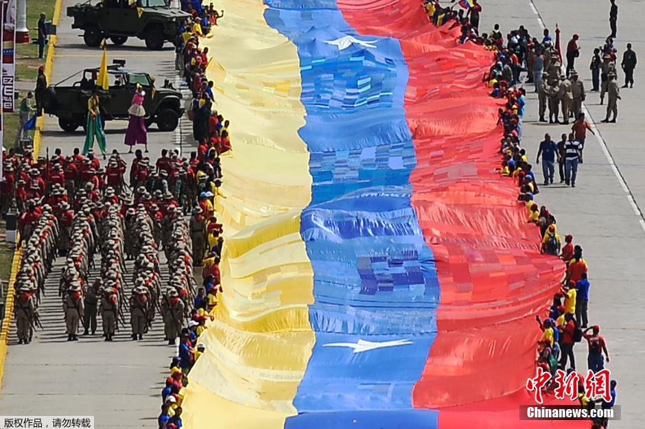 图为玻利瓦尔民兵展示1200米长委内瑞拉国旗。