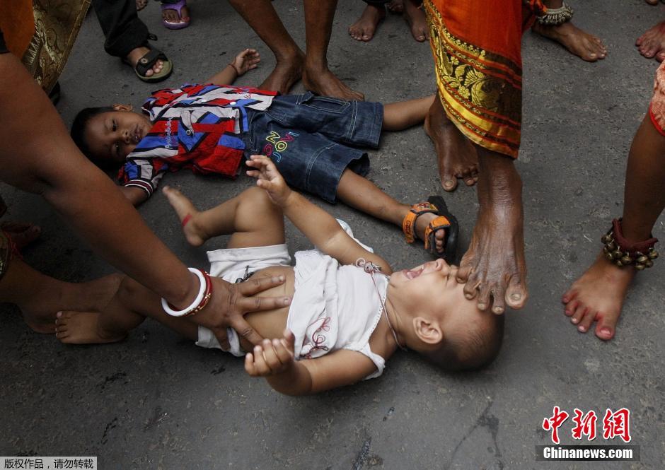 当地时间2015年4月13日,印度加尔各答,印度教徒庆祝Gajan节。教徒脚踩婴儿,为他们祈福。