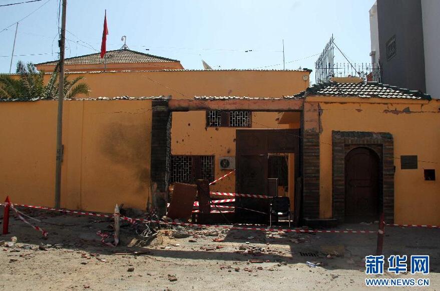 图为2015年4月13日在利比亚首都的黎波里拍摄的摩洛哥驻利比亚大使馆遭炸弹袭击后的现场。利比亚安全部门消息人士13日说,摩洛哥驻利比亚大使馆当天凌晨遭炸弹袭击,但没有造成人员伤亡。