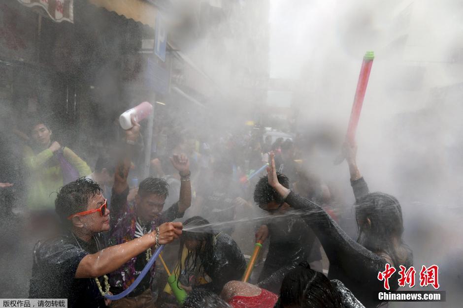当地时间2015年4月12日,泰国曼谷,外国游客参加泼水节,庆祝泰国传统新年,湿身打水仗High翻天。