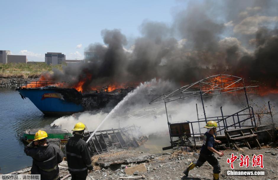 当地时间4月12日,菲律宾首都马尼拉南部的一条河中,一艘废弃了两年的船舶发生火灾,并导致相邻的两艘船损毁。图为消防员救火现场。