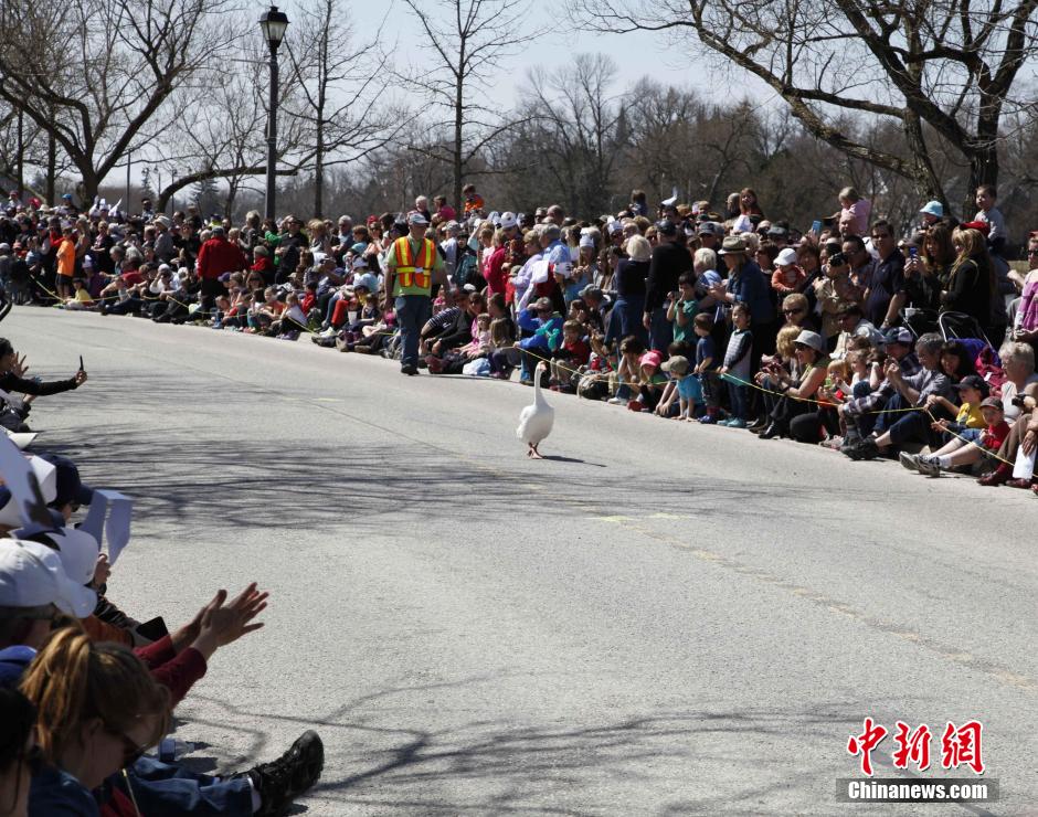 加拿大滑铁卢地区Stratford市当地时间4月12日举行一年一度的天鹅大游行,迎接春天。当天,总共有22只羽毛洁白的天鹅参加了大游行,整个大游行从下午2时开始,持续了十几分钟。天鹅大游行是当地传统的迎接春天的一种方式,由于声名远播,也渐渐成为吸引当地人踏春和外来游客观光的项目。徐长安 摄