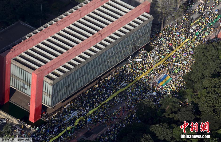图为巴西艺术博物馆前,民众参与抗议活动。