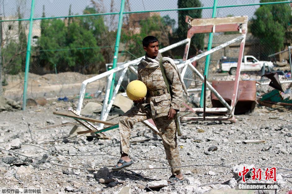 当地时间2015年4月12日,也门首都萨那北部的al-Yarmuk足球俱乐部遭到沙特等国的空袭。沙特“果断风暴”军事行动发言人艾哈迈德在4月11日的每日战况通报会上说,从发动军事行动以来,以沙特为首的联军已出动1200架次战机对也门胡塞武装和支持前总统萨利赫的武装目标进行空袭。图为一名什叶派武装成员拿着一个足球,站在空袭后的废墟上。