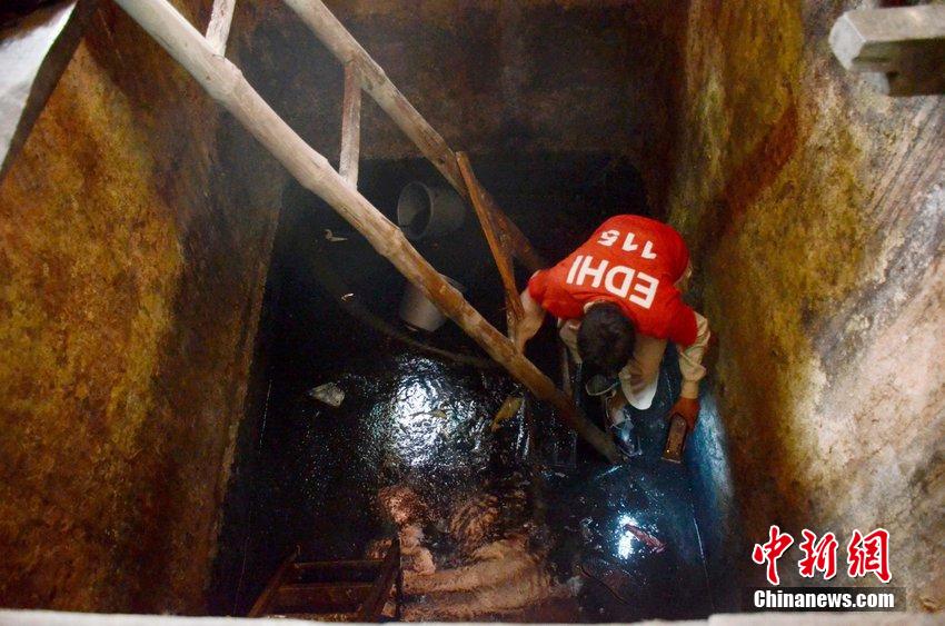当地时间2015年4月12日,巴基斯坦卡拉奇,巴基斯坦一家腌菜厂化学池中发现了7具尸体,其中包括该厂厂主。图为工作人员正在腌菜厂化学池内检查。