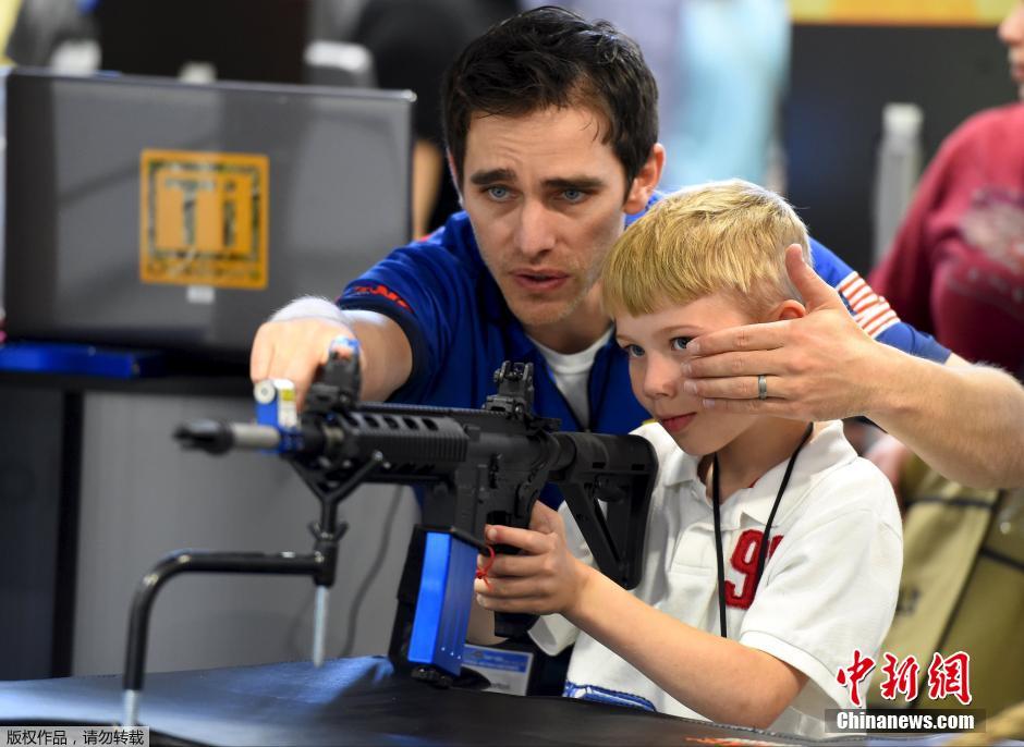 图为工作人员现场教导小朋友如何使用电子瞄准器瞄准。