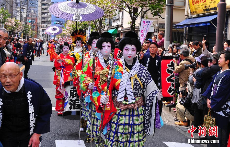 在日本东京浅草老街,4月12日举行的传统街区活动“一叶樱祭”中,演绎再现旧时江户花柳街巷“花魁巡游”情形,吸引众多市民围观。中新社发 王健 摄