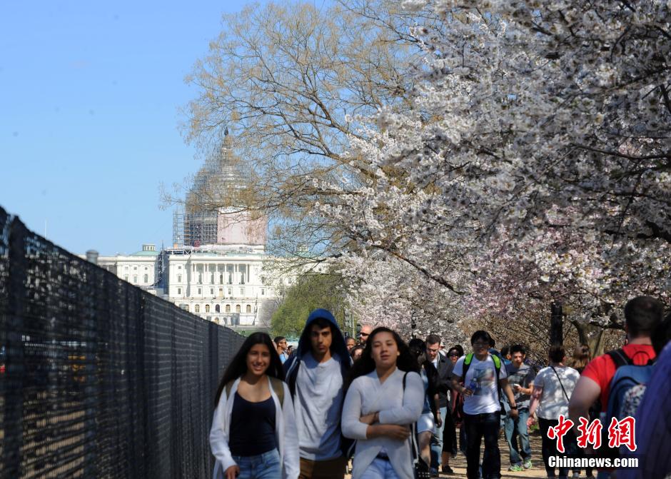 美国首都华盛顿国会山当地时间4月11日下午发生枪击案,一位持枪人士在国会大厦西侧饮弹自尽,事件一度造成国会封锁。当天还是华盛顿举行一年一度樱花节大游行的日子,大量民众聚集在市中心赏花游玩。图为枪击案发生后,国会附近仍有不少游客继续驻足、赏花。中新社发 张蔚然 摄