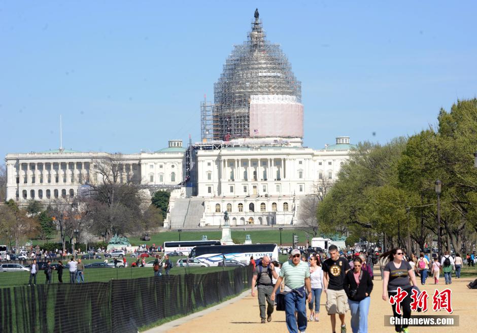 美国首都华盛顿国会山当地时间4月11日下午发生枪击案,一位持枪人士在国会大厦西侧饮弹自尽,事件一度造成国会封锁。当天还是华盛顿举行一年一度樱花节大游行的日子,大量民众聚集在市中心赏花游玩。图为枪击案发生后,仍有不少游客在国会附近驻足流连。中新社发 张蔚然 摄