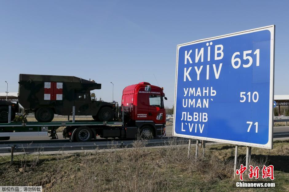 当地时间2015年4月10日,乌克兰利沃夫,美国洛克希德C-130大力神(Lockheed C-130 Hercules)军用飞机以及军用车辆运抵乌克兰,3月30日,乌克兰内政部长阿瓦科夫(Arsen Avakov)称,在基辅为控制乌东部民间武装而战之际,数百美国空降兵将于4月20日起训练乌克兰士兵。