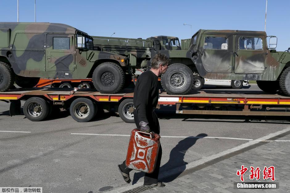 当地时间2015年4月10日,乌克兰利沃夫,美国洛克希德C-130大力神(Lockheed C-130 Hercules)军用飞机以及军用车辆运抵乌克兰,3月30日,乌克兰内政部长阿瓦科夫(Arsen Avakov)称,在基辅为控制乌东部民间武装而战之际,数百美国空降兵将于4月20日起训练乌克兰士兵。