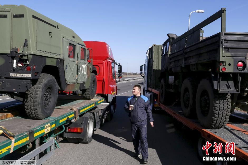 当地时间2015年4月10日,乌克兰利沃夫,美国洛克希德C-130大力神(Lockheed C-130 Hercules)军用飞机以及军用车辆运抵乌克兰,3月30日,乌克兰内政部长阿瓦科夫(Arsen Avakov)称,在基辅为控制乌东部民间武装而战之际,数百美国空降兵将于4月20日起训练乌克兰士兵。