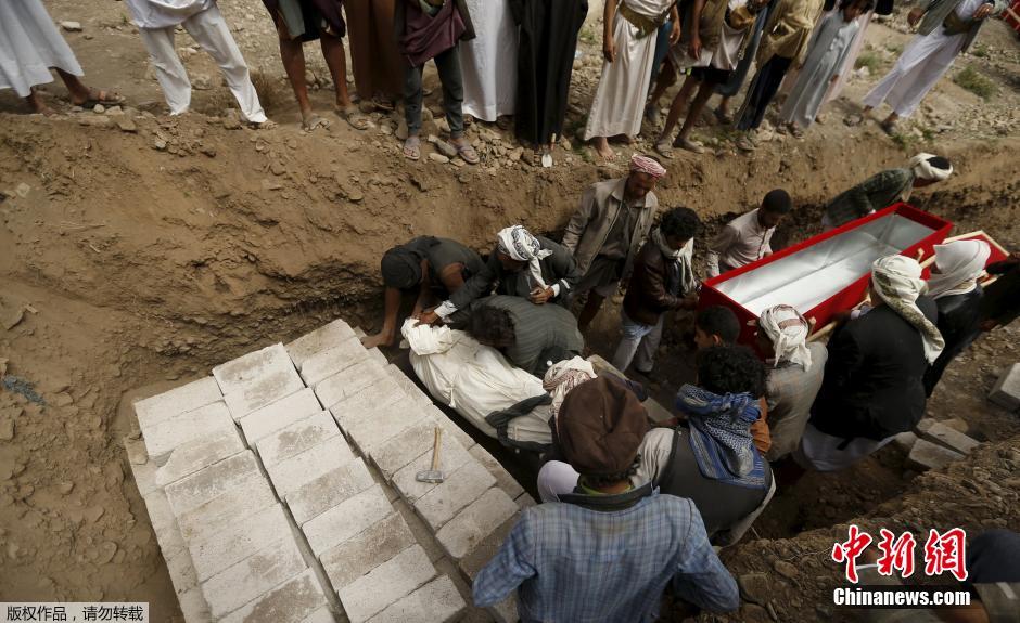 当地时间2015年4月10日,也门萨那,民众为在沙特空袭中遇难者举行葬礼。