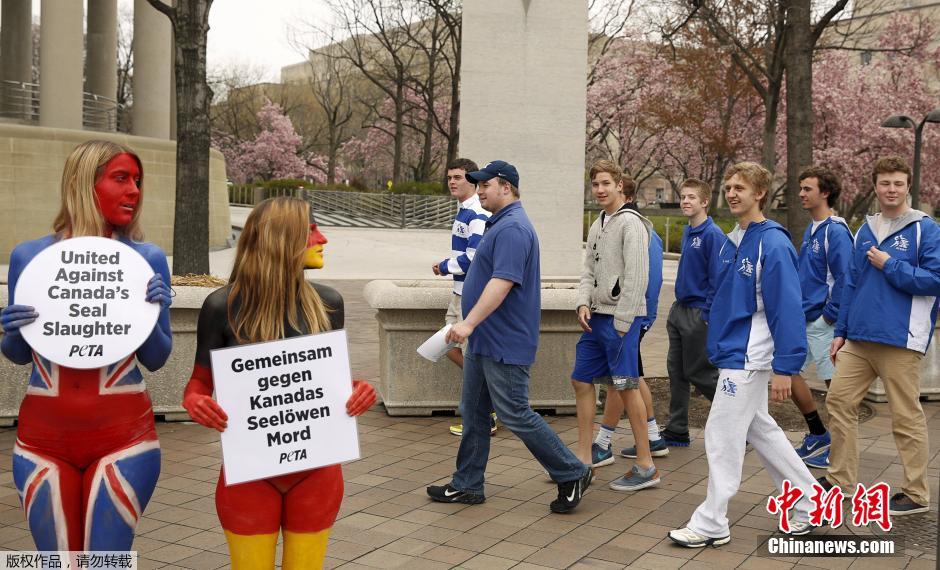 当地时间2015年4月10日,美国华盛顿,“善待动物组织”的活动家身涂国旗彩绘,在加拿大驻美使馆前半裸游行,抗议加拿大一年一度的海豹猎捕。示威者们身涂美国、墨西哥、法国、俄罗斯、德国和英国国旗样式的彩绘,这些国家都禁止猎杀海豹。
