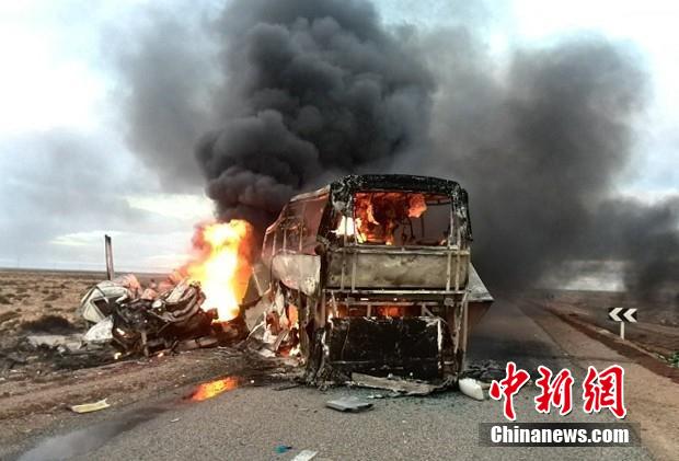 当地时间2015年4月10日,摩洛哥坦坦,摩洛哥一辆卡车与一辆运动员乘坐的巴士车迎头相撞。官员与当地媒体报道称,事故已造成至少31人死亡,9人受伤。据报道,巴士车从该国北部一个比赛现场出发,运送年轻的运动员与教练,在南部城市坦坦附近,与卡车相撞后起火。