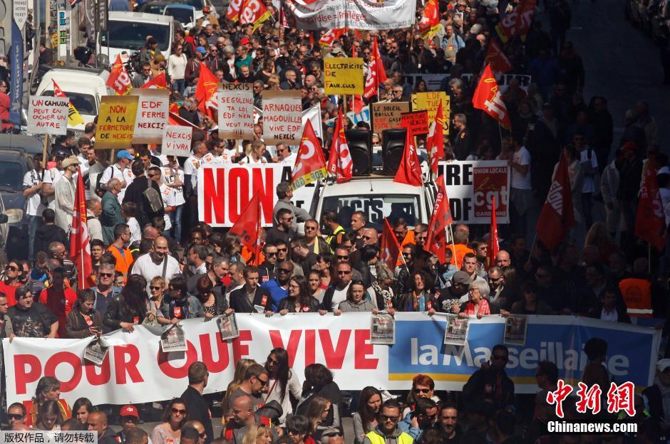 当地时间2015年4月9日,法国马赛,来自各行各业的民众纷纷加入游行队伍,抗议政府财政紧缩政策。