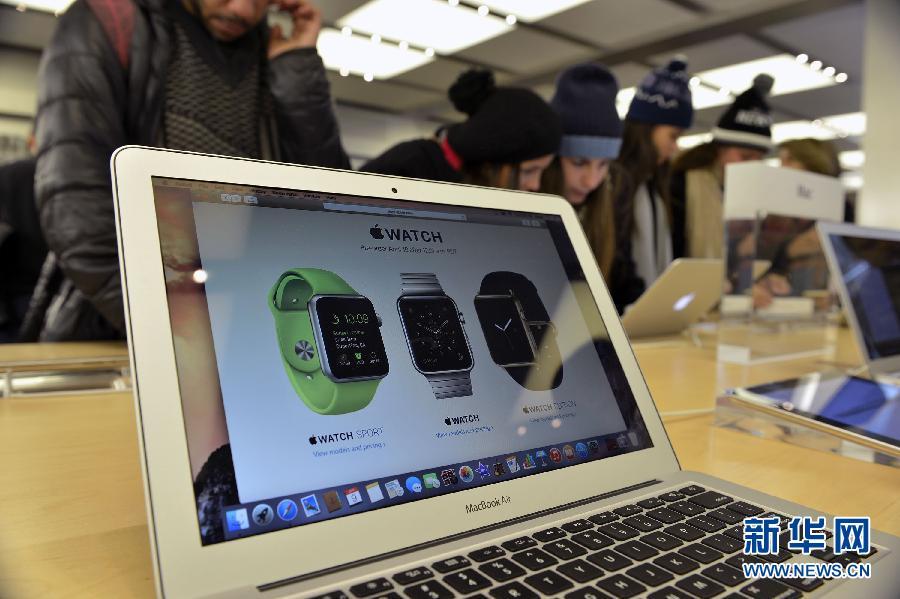 4月9日,顾客在纽约第五大道苹果旗舰店体验苹果产品。苹果公司推出的第一代智能手表Apple Watch将于美国西部时间4月10日零点开始预售,顾客可以网上预订或在零售店预约试戴。王雷 摄 图片来源:新华网