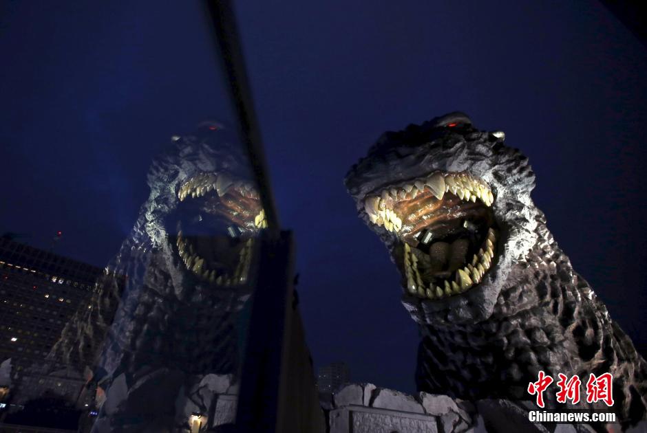 当地时间2015年4月9日,日本东京歌舞伎町商业区的酒店推出“哥斯拉房间”,一座巨型的哥斯拉雕塑成为酒店的标志。